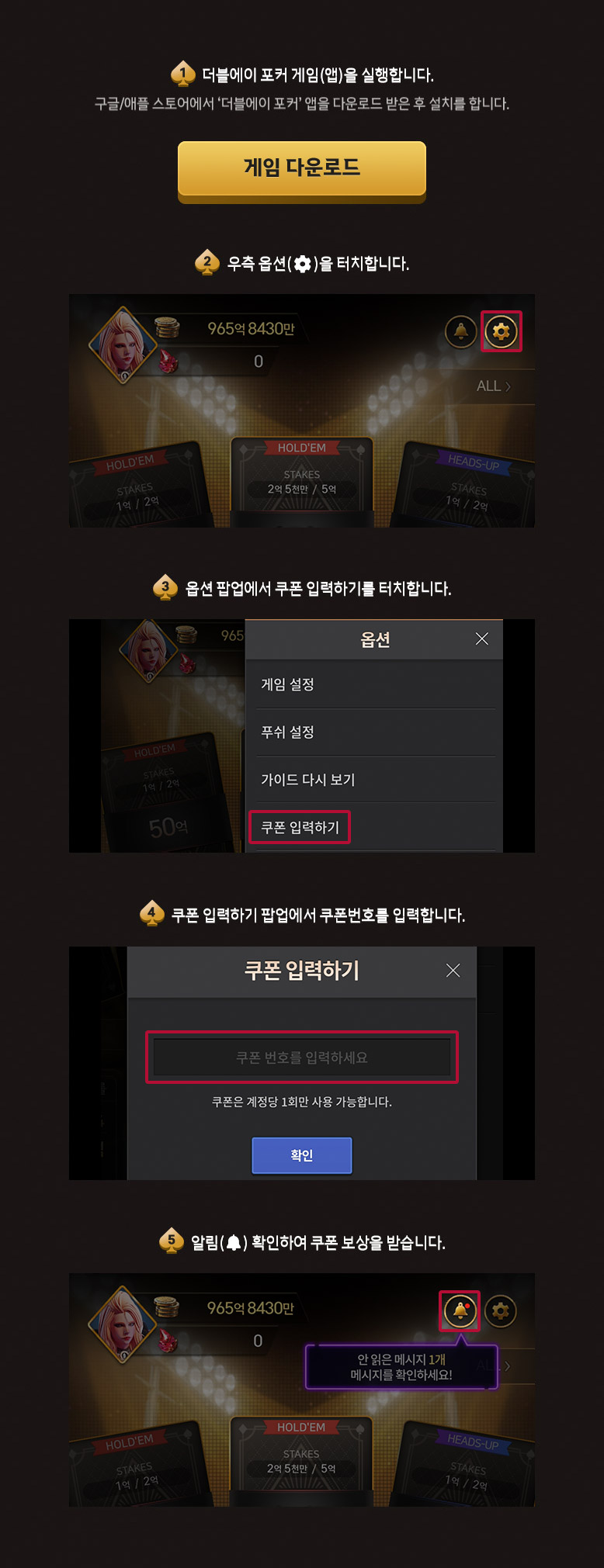 - 알림 확인하여 쿠폰 보상을 받습니다.