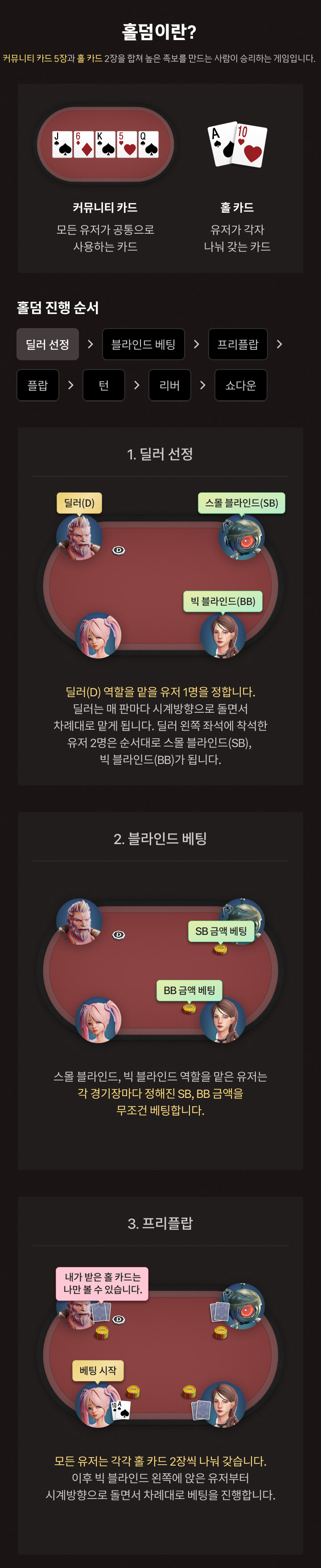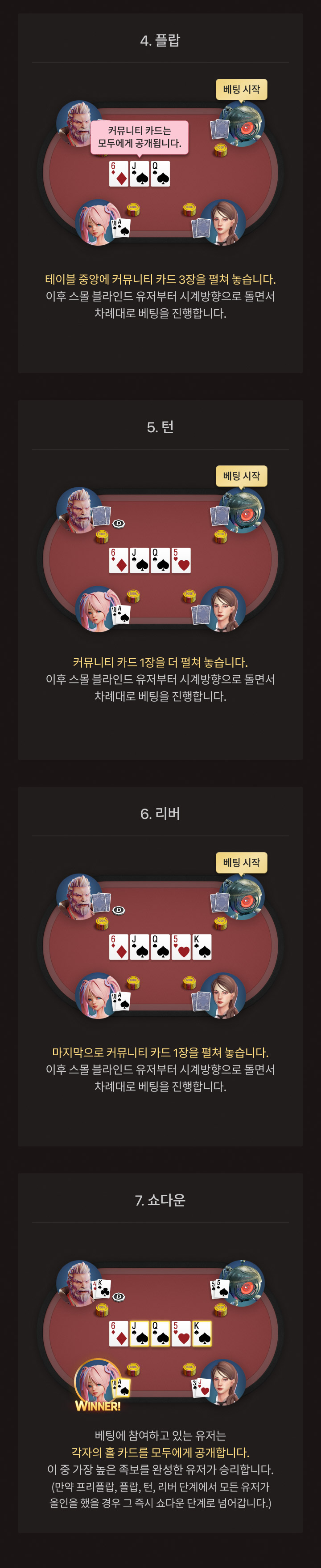 - 홀 카드: 유저가 각자나눠 갖는 카드