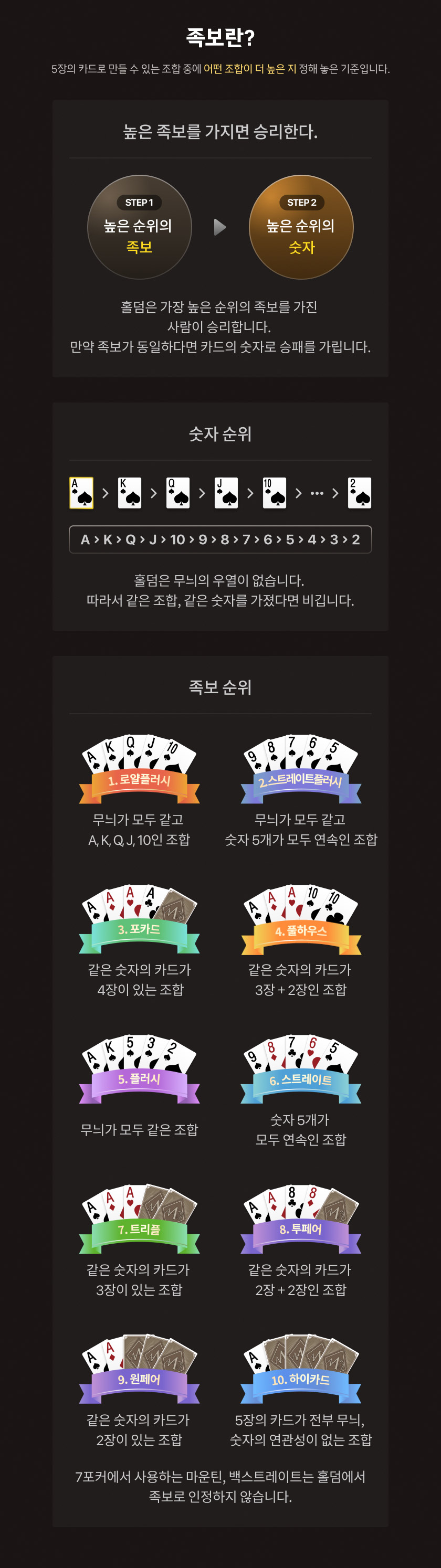 홀덤은 가장 높은 순위의 족보를 가진 사람이 승리합니다. 만약 족보가 동일하다면 카드의 숫자로 승패를 가립니다.
