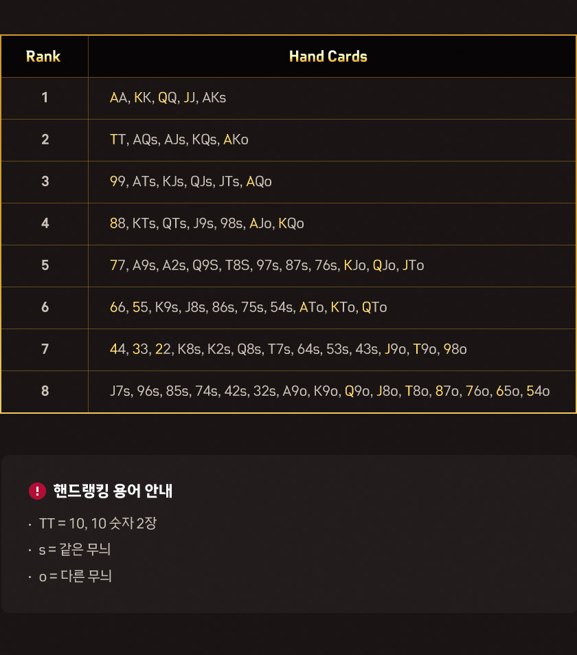 5장의 카드로 만들 수 있는 조합 중에 어떤 조합이 더 높은 지 정해 놓은 기준입니다.