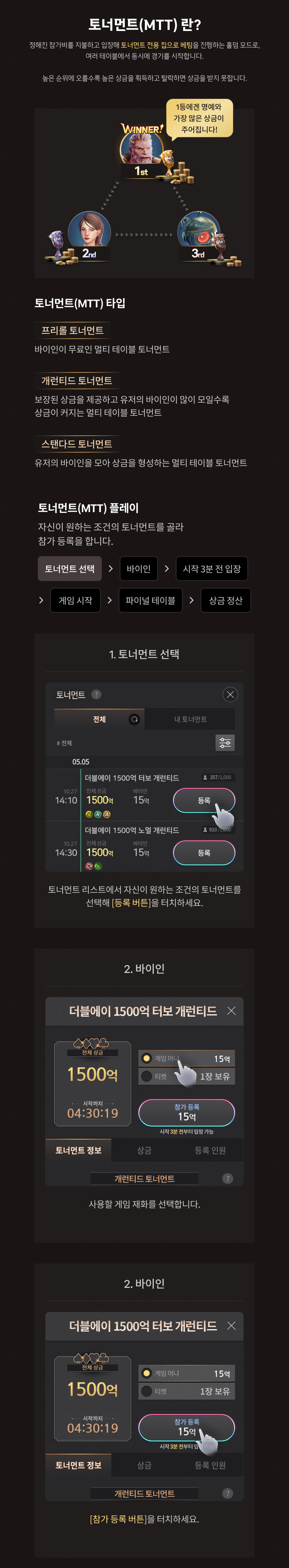- 2. 바이인: 사용할 게임 재화를 선택합니다. [참가 등록 버튼]을 터치하세요. [등록하기 버튼]을 터치하면 참가 등록이 완료됩니다.