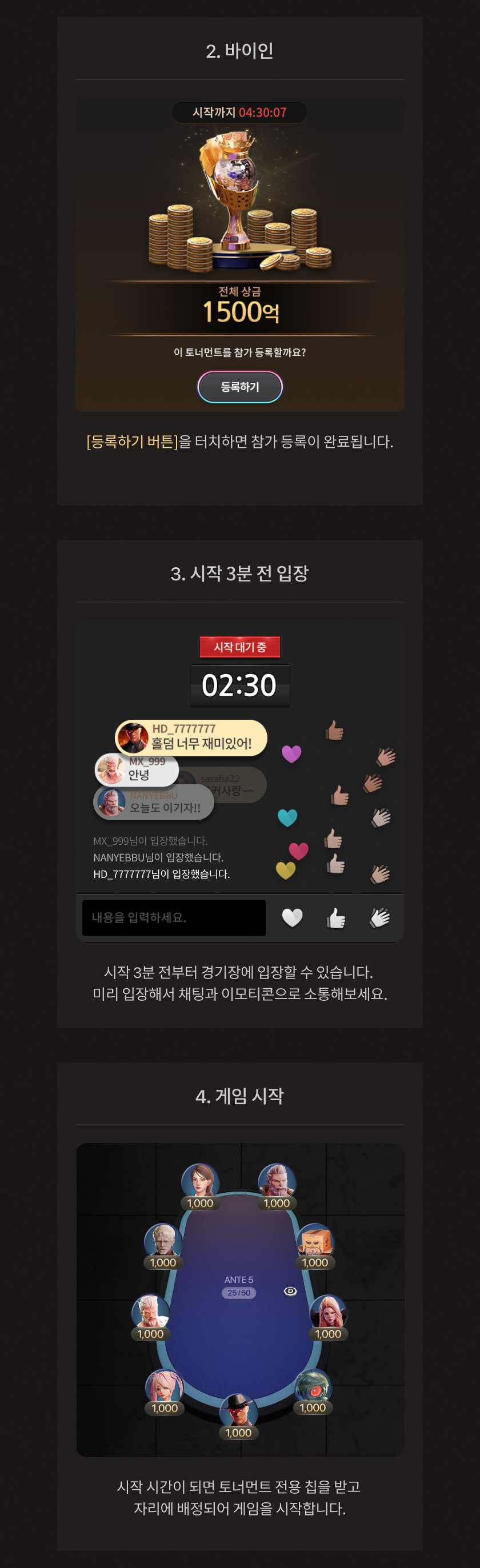 - 4. 게임 시작: 시작 시간이 되면 토너먼트 전용 칩을 받고 자리에 배정되어 게임을 시작합니다.