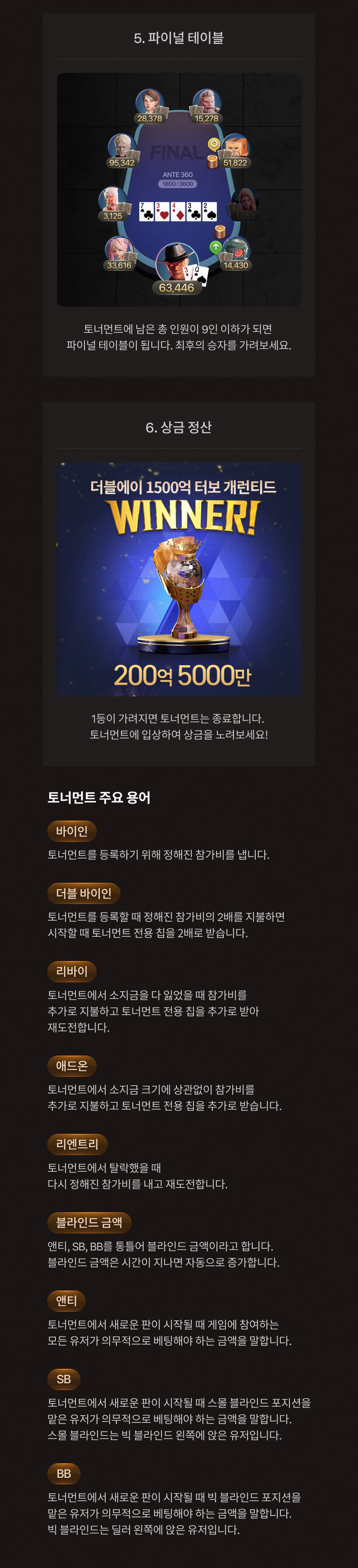 - 5. 파이널 테이블: 토너먼트에 남은 총 인원이 9인 이하가 되면 파이널 테이블이 됩니다. 최후의 승자를 가려보세요.
