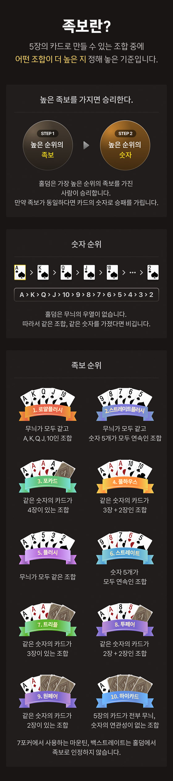 7포커에서 사용하는 마운틴, 백스트레이트는 홀덤에서 족보로 인정하지 않습니다.