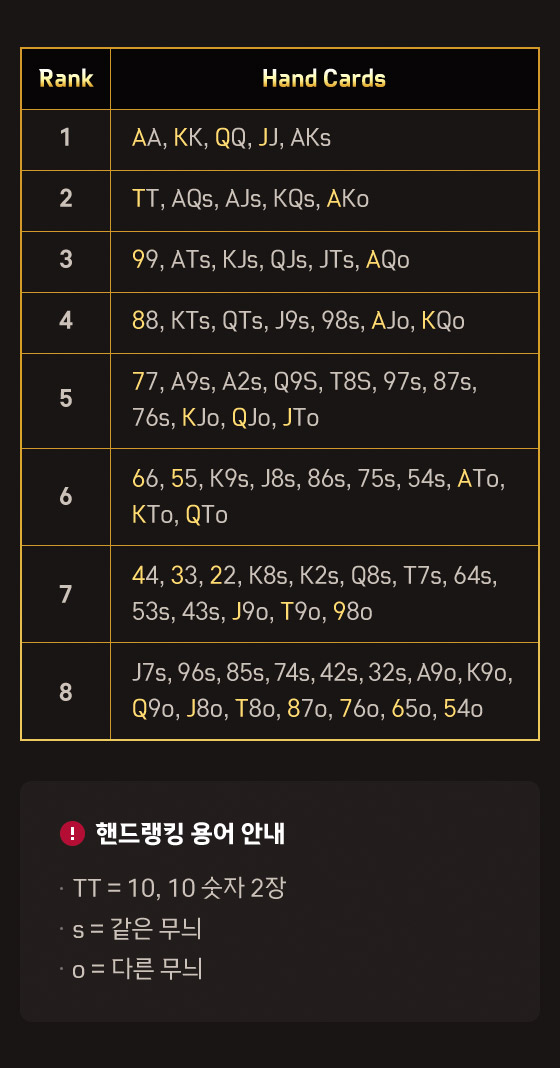 5장의 카드로 만들 수 있는 조합 중에 어떤 조합이 더 높은 지 정해 놓은 기준입니다.
