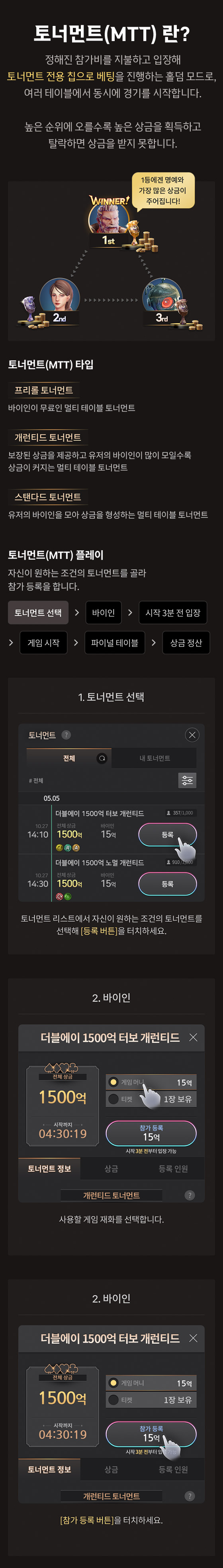- 2. 바이인: 사용할 게임 재화를 선택합니다. [참가 등록 버튼]을 터치하세요. [등록하기 버튼]을 터치하면 참가 등록이 완료됩니다.