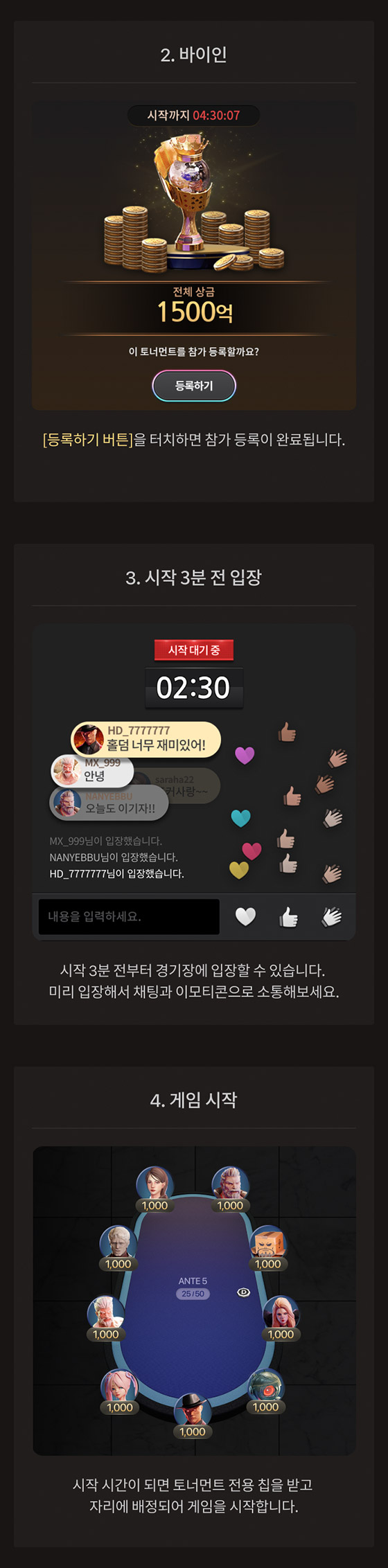 - 4. 게임 시작: 시작 시간이 되면 토너먼트 전용 칩을 받고 자리에 배정되어 게임을 시작합니다.