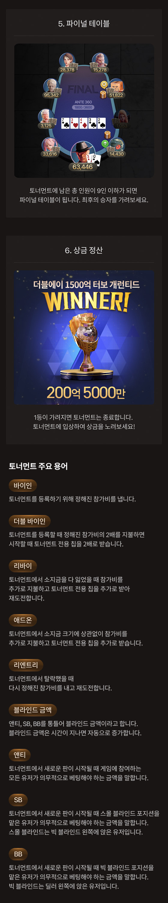 - 5. 파이널 테이블: 토너먼트에 남은 총 인원이 9인 이하가 되면 파이널 테이블이 됩니다. 최후의 승자를 가려보세요.